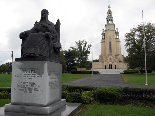 That’s St. Olga, seated in majesty. Behind her is a memorial church for the victims of Stalin’s famines; behind that is a lovely, tree-lined cemetery; and the entire area is part of the larger headquarters of the Ukrainian Orthodox Church of the USA, otherwise known as the Ecumenical Patriarchate of Constantinople.