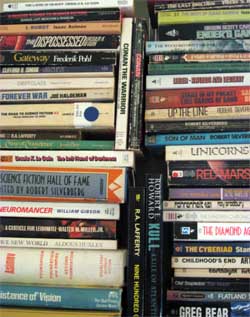 Thus begins the blur: creeping through library basements, climbing over warehouse piles, swinging a sun-bright shopping basket where books replace groceries in long, looming rows. Look: A spaceship reminds you of a long-lost friend, the guy who once loaned you this book. Over there is the novel you never quite got; its crude, trippy cover still mocks you. A fantasy trilogy leaps from a shelf, desperate to be held again; years ago, you all spent a week at the beach. Paperbacks peep and cry out sideways, and people gawk as titles start to blur: Axaxaxas mlö, dhcmrlchtdj…