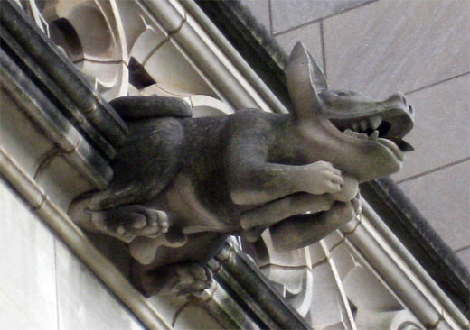Gasch’s Guide to Gargoyles and Other Grotesques says that this bone-clutching critter on the north nave of the National Cathedral is a basenji, an African dog that can’t bark but does tend to yodel. Our neighborhood basenji earned his place in the 1959-1960 gargoyle design competition; his artist, as you’ll see, is already the subject of apocrypha.
