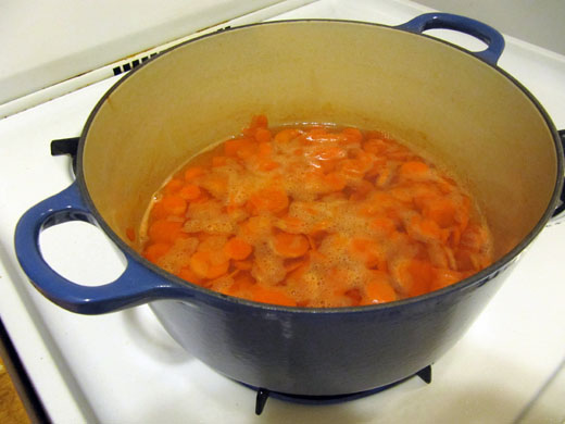 Lacking red carrots, I had to go with plain old orange. Here they are, simmering in the Le Creuset like flunkies in Charlemagne’s bath house.