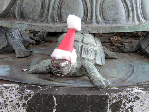 “Sure, Charlie Brown,” says one of six bronze turtles in tiny Santa caps, “I can tell you what medievalism is all about.”