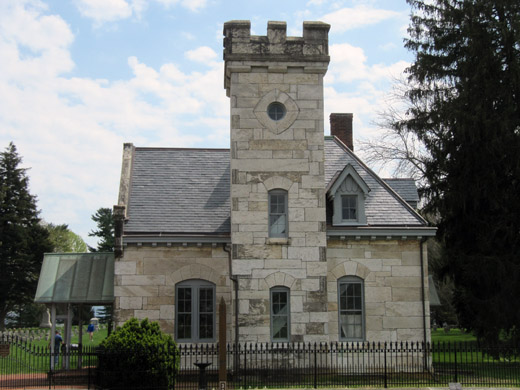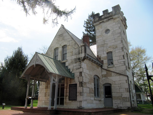 What an odd, dreamlike blending of castle and house. According to a memo on this lodge by the National Park Service’s Historic American Buildings Survey, the federal government ran 80 national cemeteries by 1880, but Antietam was one of only two originally established and run by a state. Maryland got the jump on things by convening its own cemetery commission, sending the Confederate dead to be buried elsewhere, and hiring versatile D.C.-based architect Paul Pelz to design and build this lodge in 1867. The Park Service helpfully points out its distinctive features: “stone walls, turret tower with battlements, pointed arch windows, and a gable porch with crossbracing vergeboards.” (The latter term was new to me.) The tower gave veterans and visiting mourners a view of the battlefield, but this little castle didn’t earn fealty from locals. According to the Park Service, ne’er-do-wells loitered in the cemetery, incurring the wrath of superintendents who demanded that they stop using the grounds (in the words of an 1881 War Department inspector) “as a lounging place for the floating part of the citizens, canal men, loafers, young fellows and their sweethearts.”
