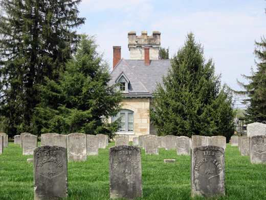 According to architectural historian Catherine Zipf, the job of designing and beautifying Civil War cemeteries fell to Montgomery Meigs, Quartermaster General of the U.S. Army during and after the war. Every cemetery was to have a superintendent’s lodge, and Meigs standardized the design: each lodge was located near the gate or the edge of the cemetery, shaped like an L with a porch and reception hall, and built in a scaled-down French Second Empire style. Here’s a good example from Glendale National Cemetery in Richmond, Virginia: