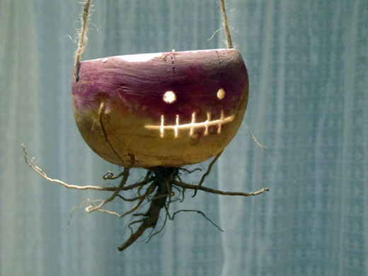 So why did lantern-carving immigrants from the British Isles turn in their turnips for all things cucurbita? Some people have suggested that North American turnips tend to be smaller than their New World cousins, and thus harder to carve, but I don’t think that’s it; rather, pumpkins have one clear advantage over hollowed-out turnips. Carved pumpkins can survive with their dignity intact for days or weeks if the weather’s right and squirrels don’t get into them—but our Old World jack-o’-lanterns lasted only two or three days before their little faces wizened into unrecognizability. A damned soul wandering the night for all eternity needs better visibility than that. On the other hand, turnips are faster and safer to carve and much less messy, so we’re happy to light them along our porch as tokens of fleeting glory, retelling a legend the centuries never quite quenched.